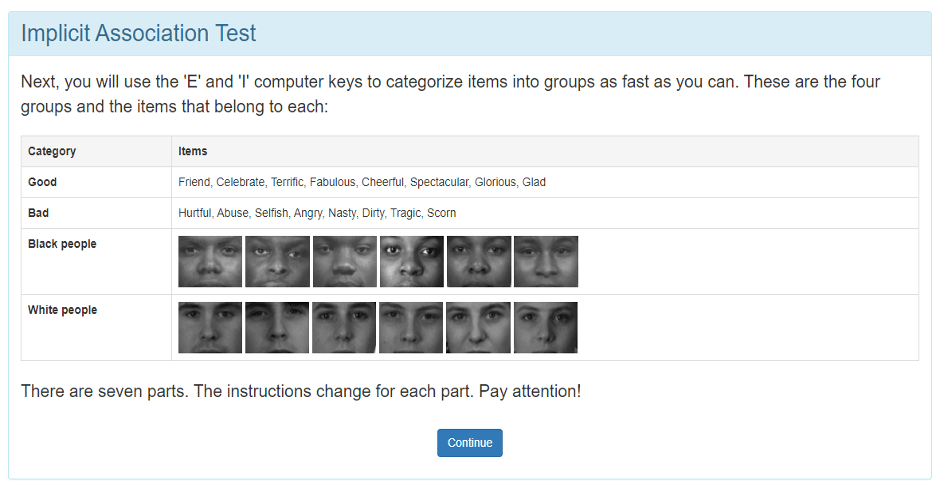 When taking the race IAT, I found it easy until they displaced my already established rhythm. I only noticed this displacement because I felt like I was sure about what category the picture or word belonged to by title but not by the position it was now moved to. In other words, I felt like the change in the new association of the words was not the problem, instead, the problem arose because they changed the keys I was supposed to press for the category. (Student, Fall 2020)